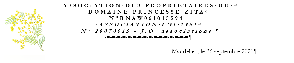 Bien chers membres, propriétaires d’un bien dans le Domaine Princesse Zita, et anciens colotis du Lotissement Princesse Zita (dissous en 2007), comme chaque année, nous vous convions à